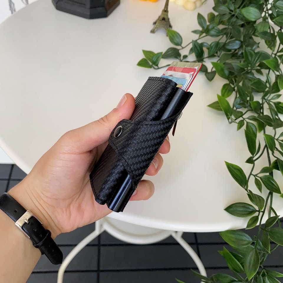 Méduse-Porte-cartes/portefeuille en cuir en fibre de carbone avec mécanisme de protection RFID