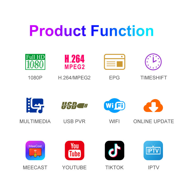 Fonction principale:MeeCast, DLNA, TV IP, DVB2IP, Youtube, Tiktok, PVR USB, TimeShift, EPG