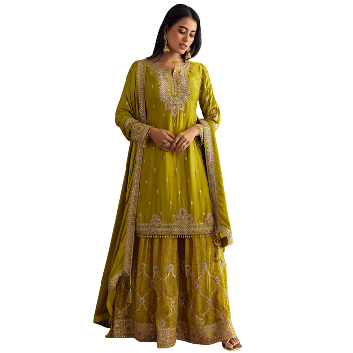 Ensemble Kurta Palazzo en Soie Georgette Bandhani Vert Mehendi Brodé Réversible pour Fête Vente en Gros Vêtements Ethniques pour Femmes Usine OEM