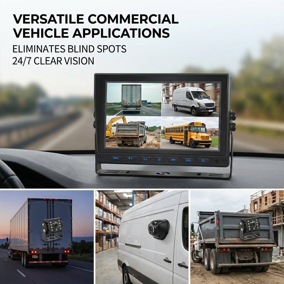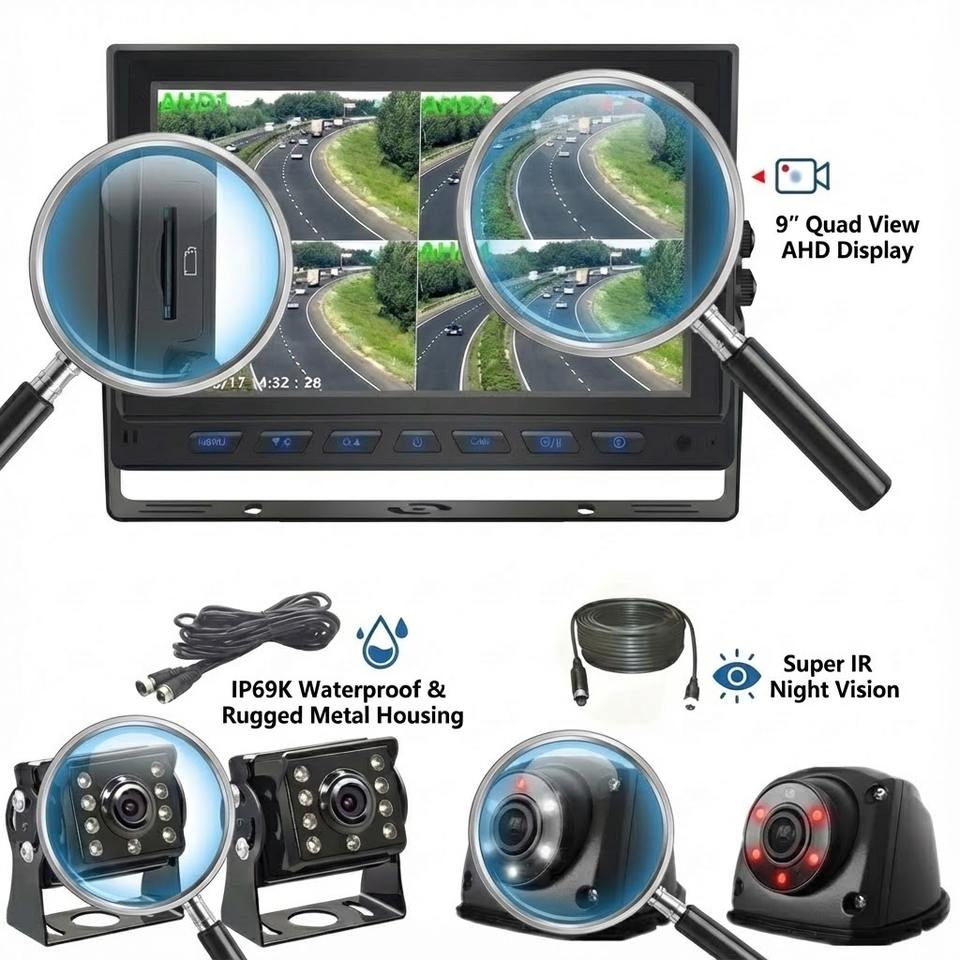 Système de surveillance pour camion Melia 9 pouces avec écran partagé, caméra de recul haute luminosité, enregistrement de stationnement 4 canaux 1080P, carte SD 256 Go