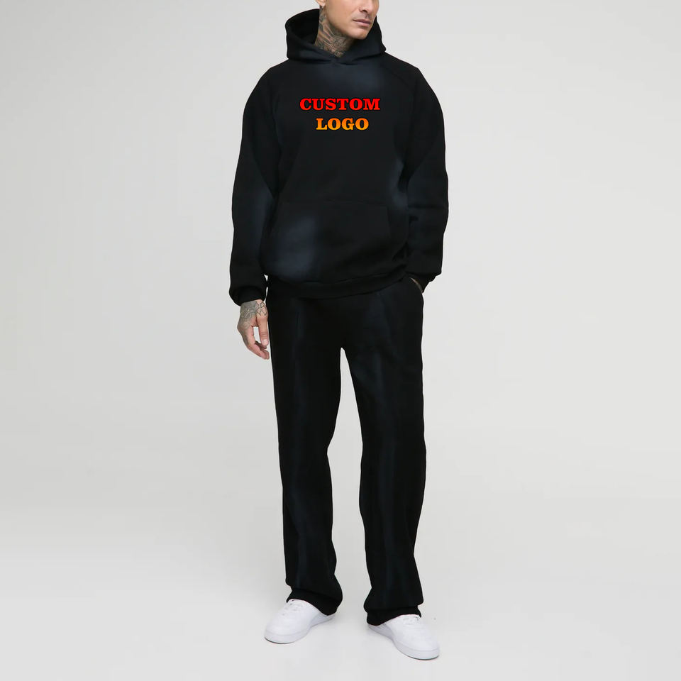 Men 100% Cotton Printed Sun Fade Washed Hoodie Flare Pants Sets Custom Distressed Embroidery Logo Reversible Breathable 2-Piece
