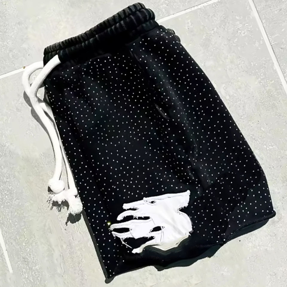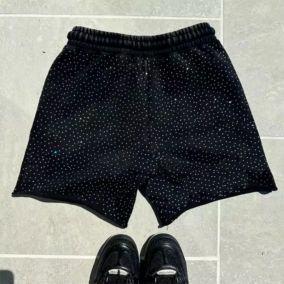 Short délavé à l'acide de couleur noire avec strass pour hommes, vêtements décontractés en coton, shorts délavés à l'acide avec appliques et distresses