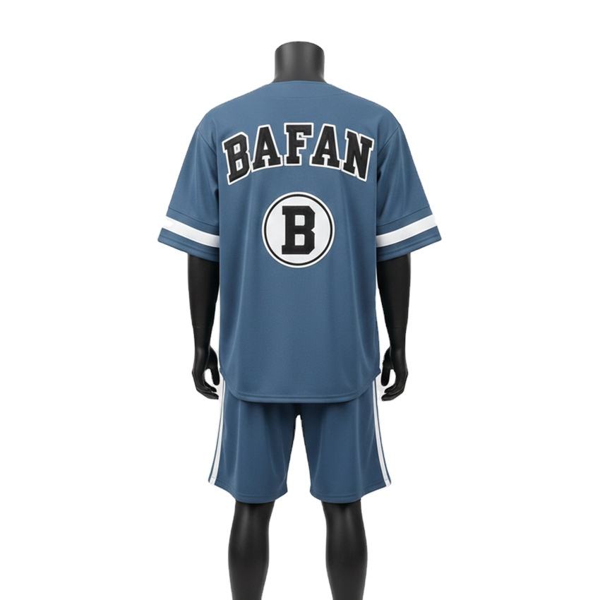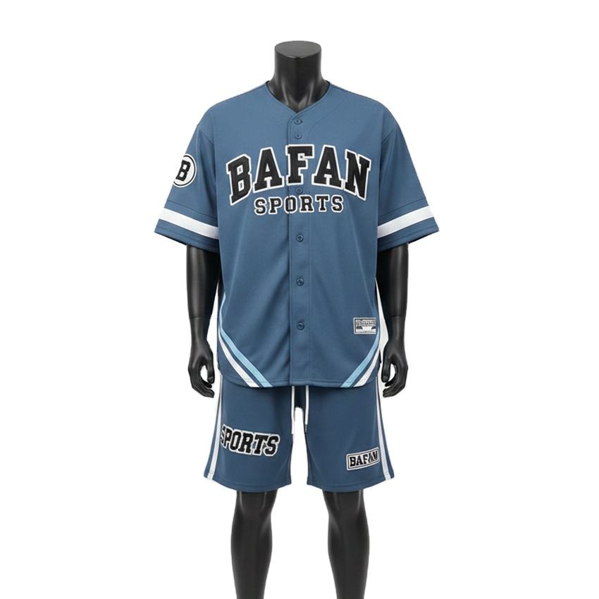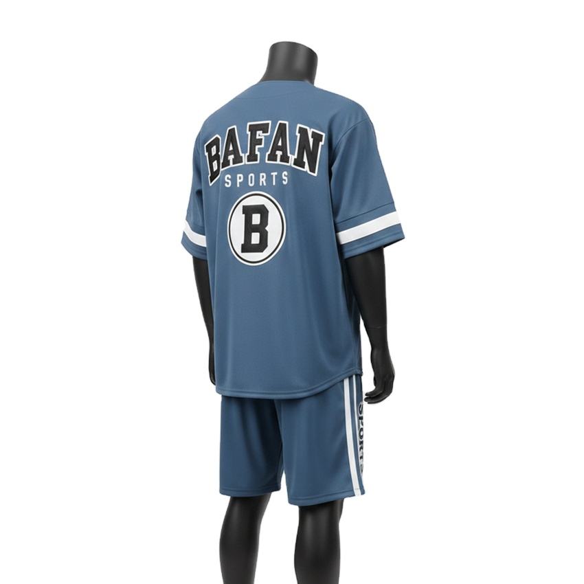 Ensemble de shorts de baseball pour hommes en polyester mesh interlock, toucher doux, panneau contrastant bleu, logo brodé personnalisé pour ensemble de shorts homme