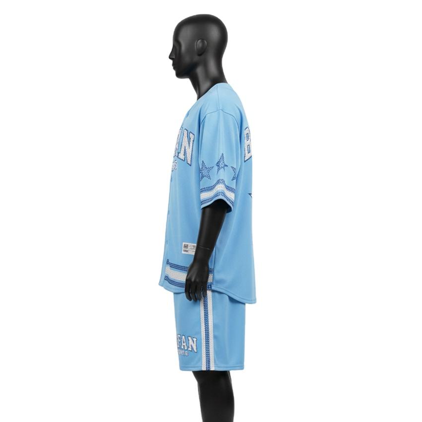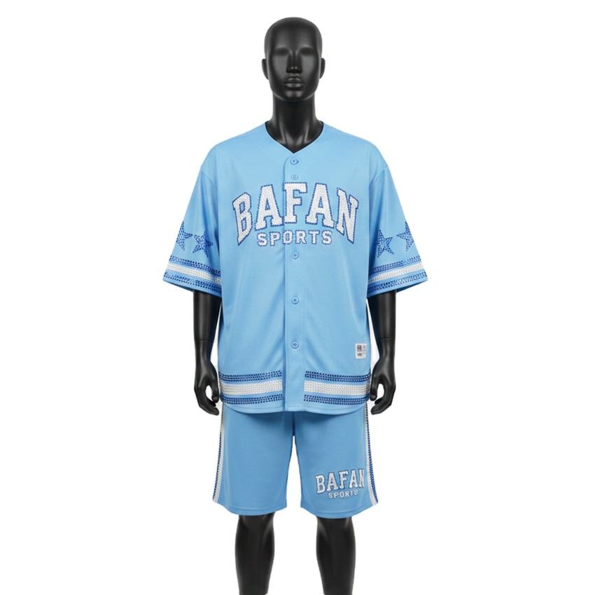 Ensemble de shorts de baseball pour hommes en tissu maille polyester doux, panneaux sportifs bleus, logo personnalisé en twill pour ensemble de shorts homme