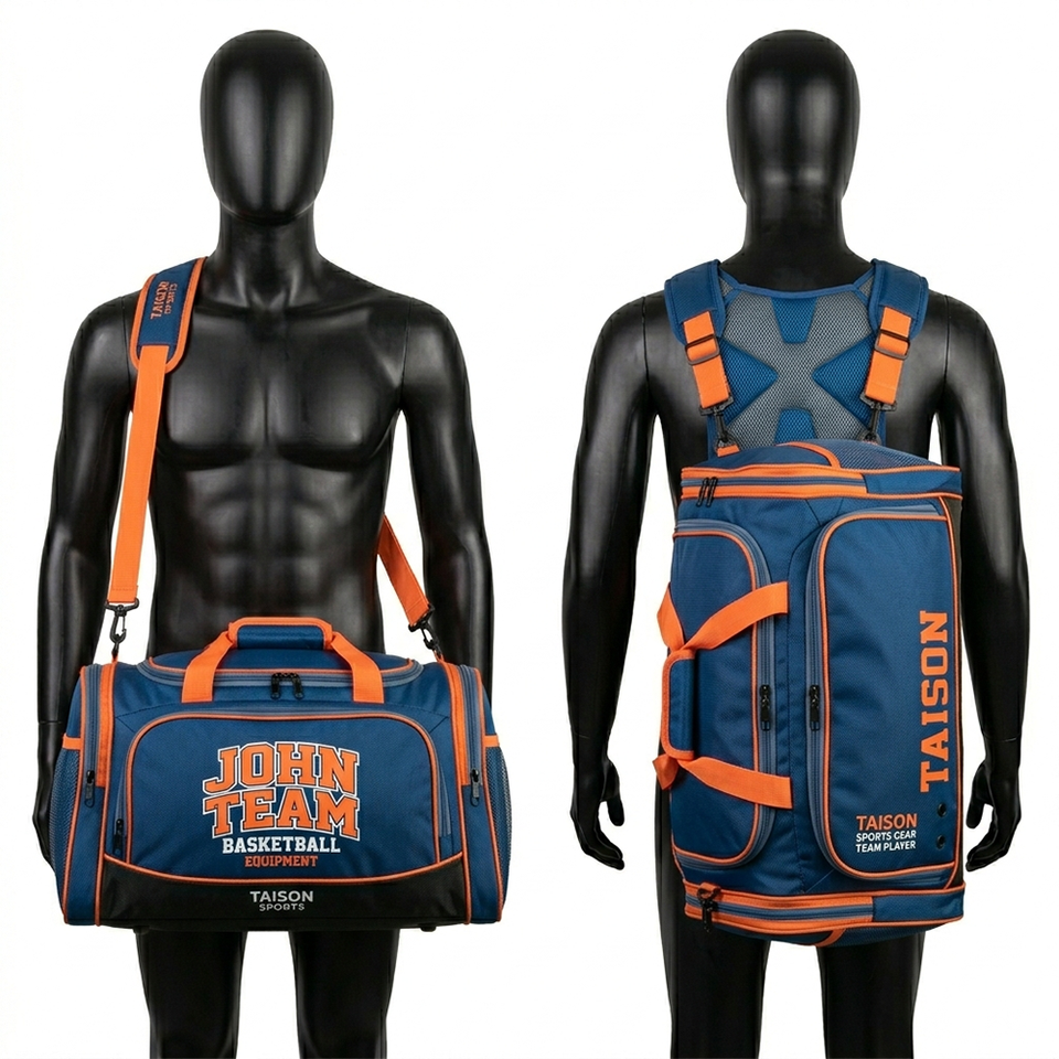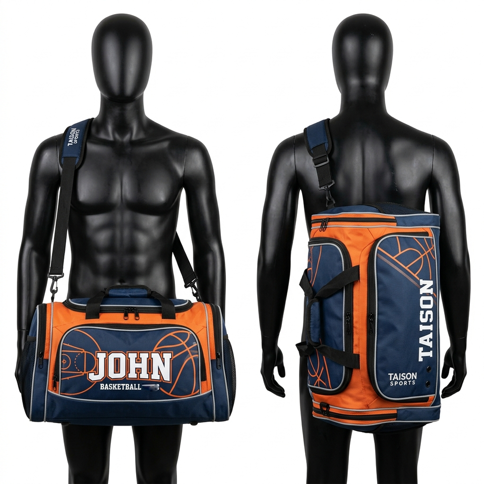 Sac de sport de basketball pour hommes en polyester 600D 320 GSM, durable, design à panneaux rouge et noir, sac de sport multi-poches, logo brodé personnalisé