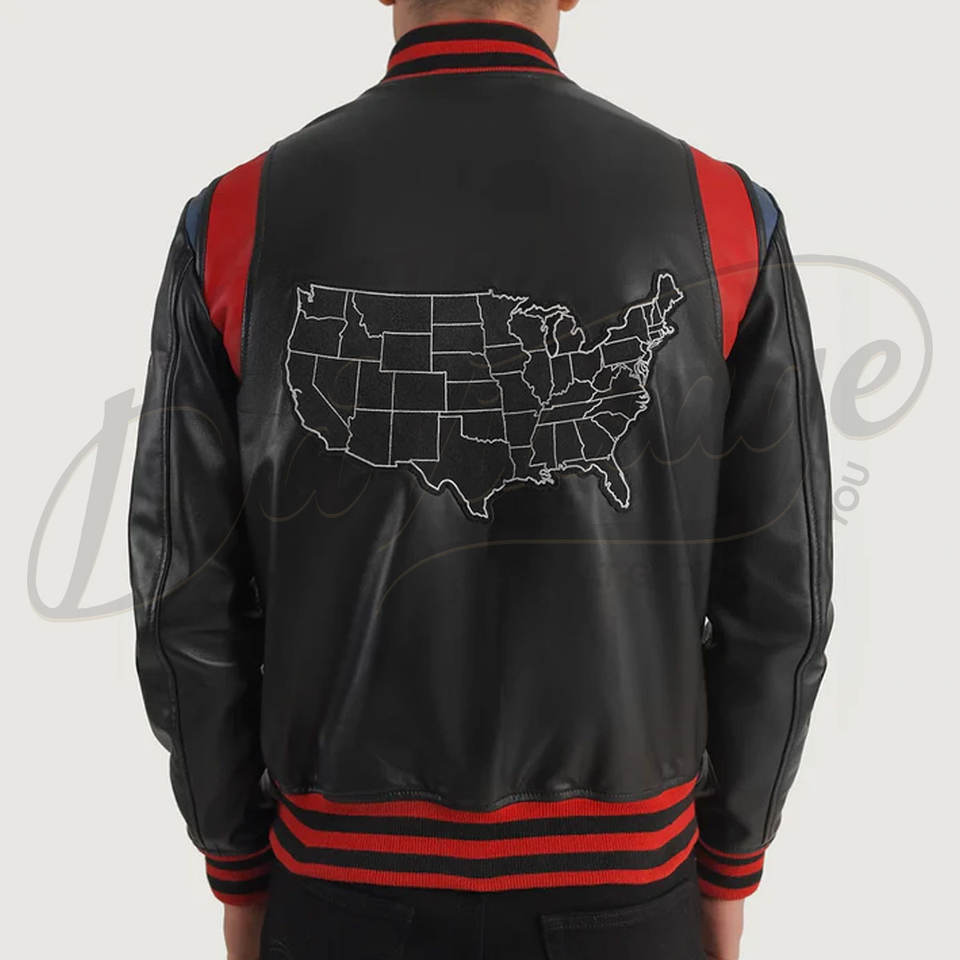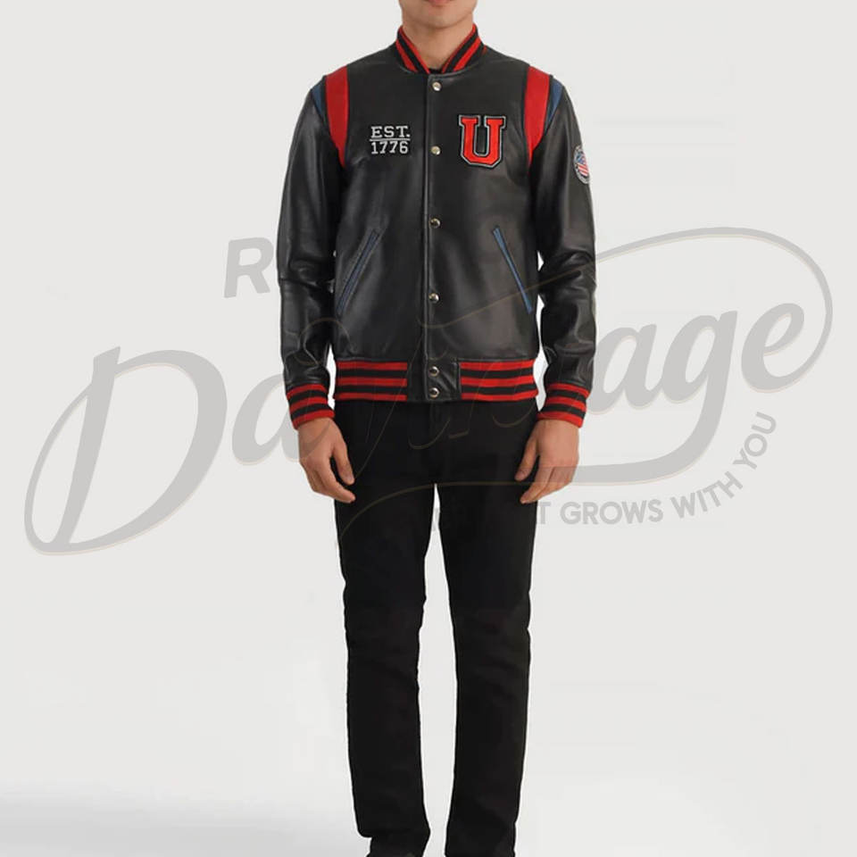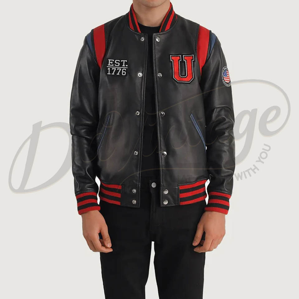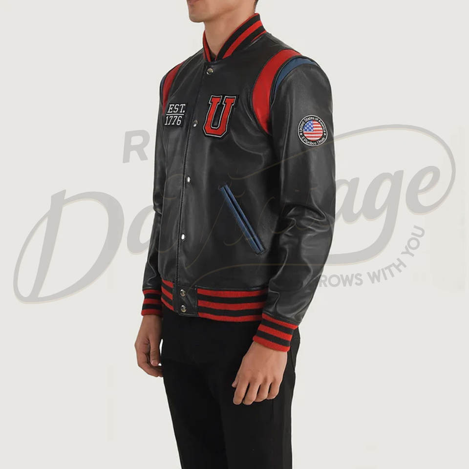 Blouson universitaire en cuir noir pour homme avec empiècements rouges aux épaules, patch personnalisé et poignets côtelés rayés