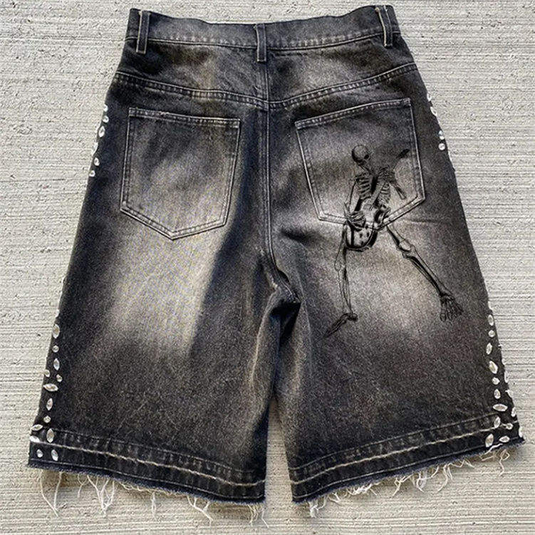 Shorts en jean déchirés noirs pour hommes avec détails cloutés et imprimé squelette, style streetwear, pour l'été