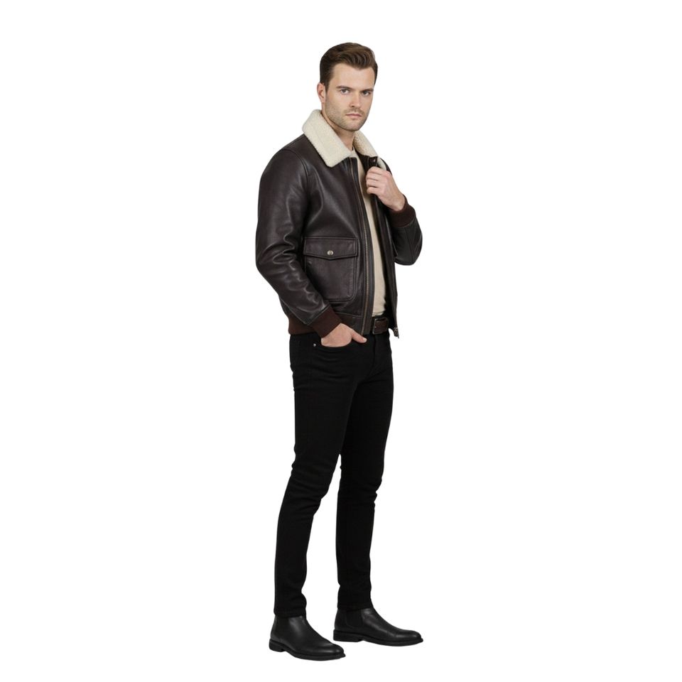 Product name:Men Choco Brown Pilot Leather Jacket with Fur Collar