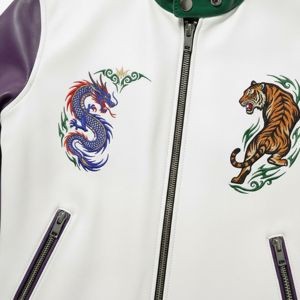 Veste en cuir brodée personnalisée pour homme, style Sukajan Dragon Tigre, blocs de couleur blanc, violet, orange, manches coupe-vent, hiver, moto