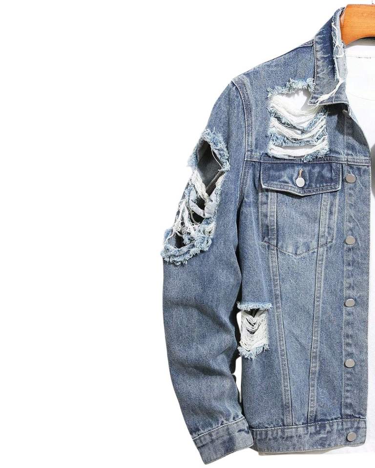 Veste en jean délavée pour homme, style vintage, déchirée, décontractée, streetwear, vêtement d'extérieur, bleu clair, tissu en coton