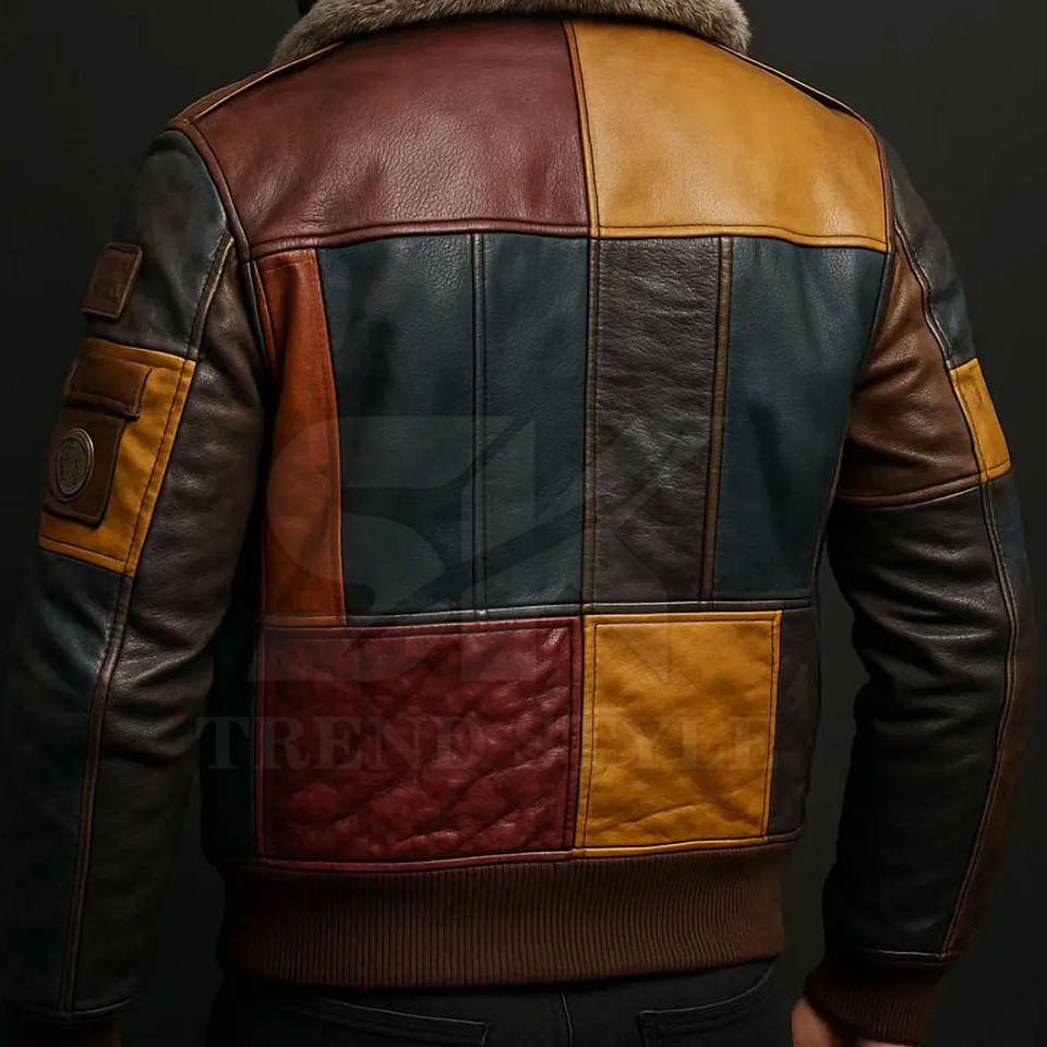 Veste en cuir patchwork tendance pour homme avec des lignes de panneaux propres et une coupe moderne Veste en cuir patchwork durable pour homme