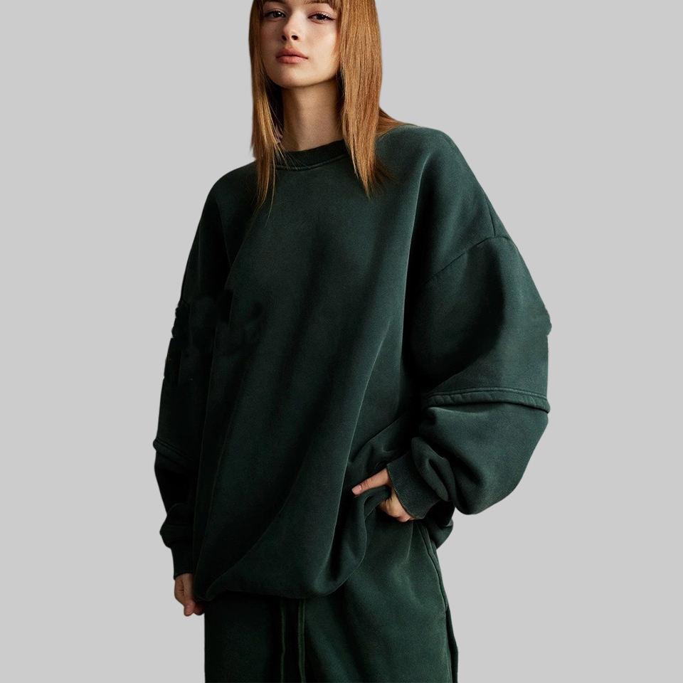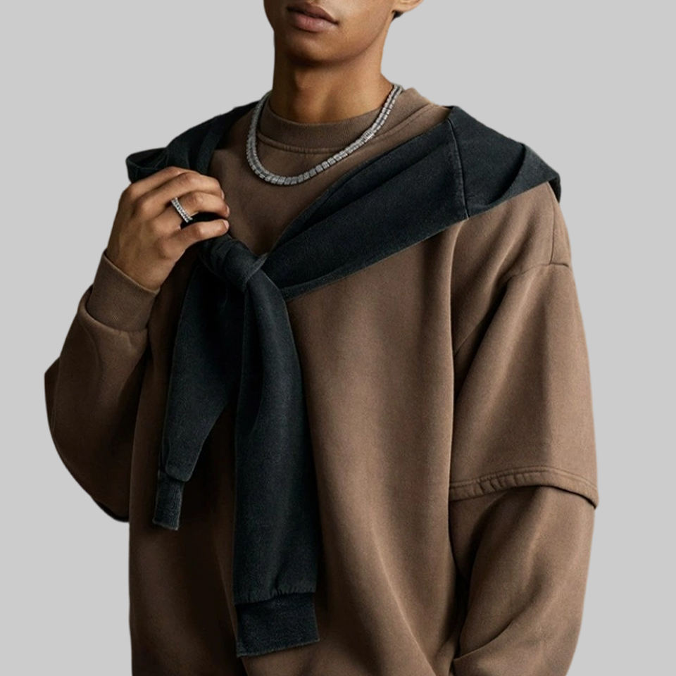 Men Fashion Washed Distressed Patchwork Fleece Sweatshirt Snowflake Crew Neck Faux Two-Piece Men's Streetwear