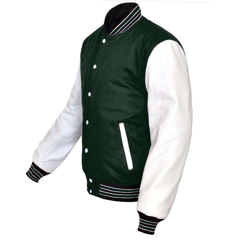 Men Green and White Varsity Letterman Jacket Wool and Leather Sleeves Long Genuine Sheepskin Thick Winter Leather Jacket