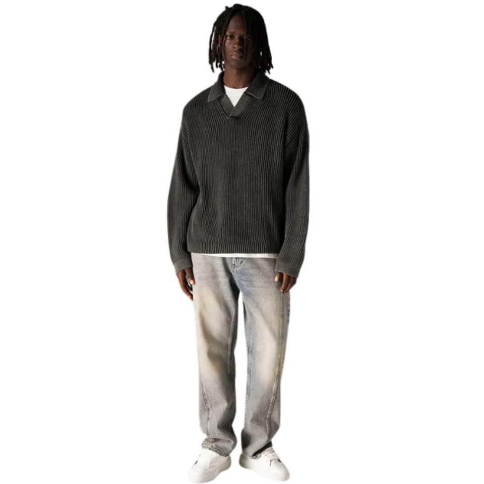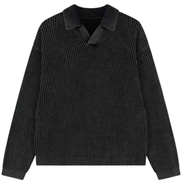 Pull polo côtelé pour homme, noir, manches longues, effet délavé, doux et texturé, décontracté, hiver, OEM