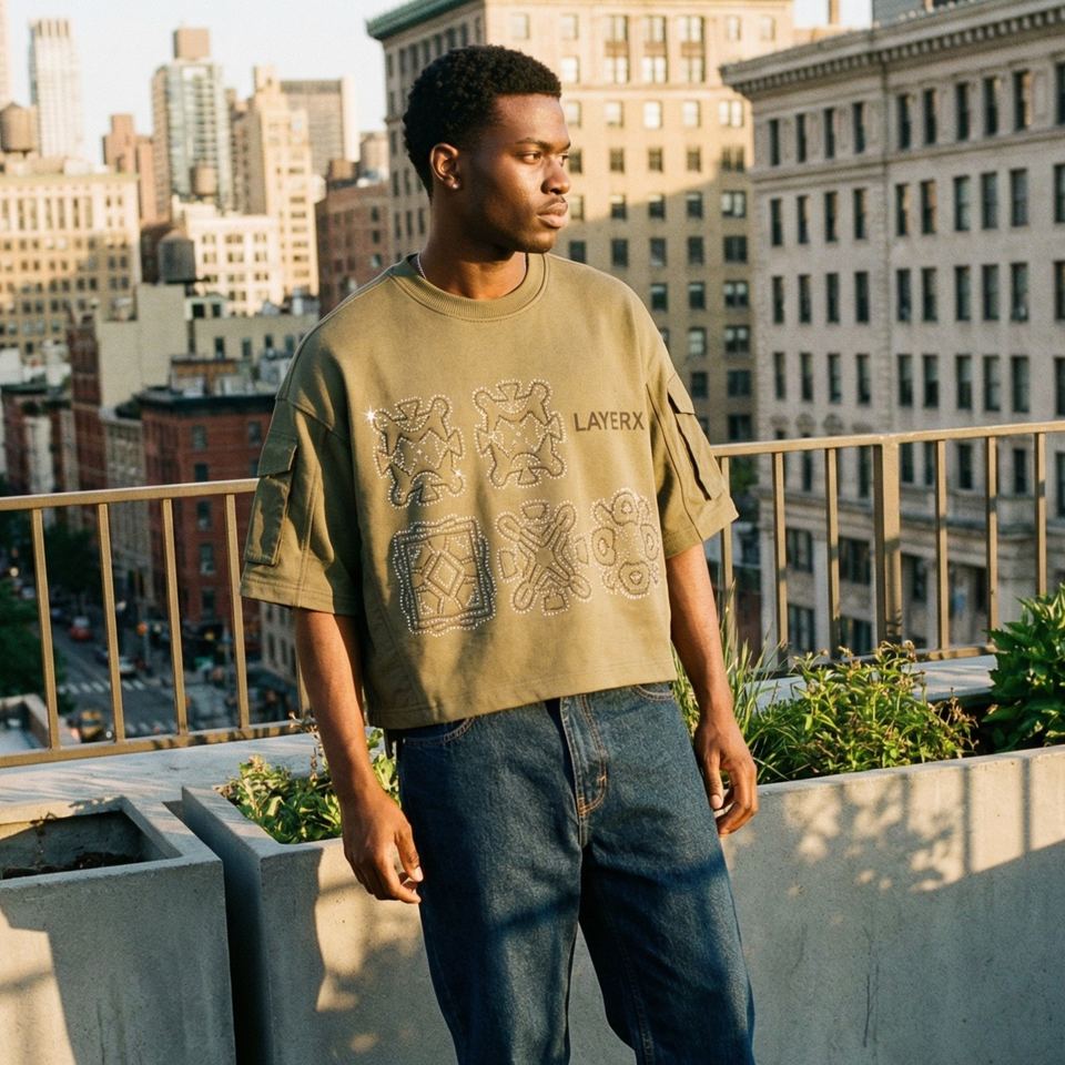 T-shirt cargo court pour homme, style punk, 100% coton, poids lourd, poche utilitaire, strass personnalisés pour ourlet superposé, streetwear