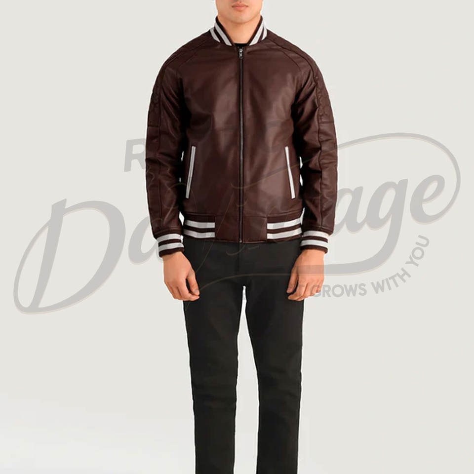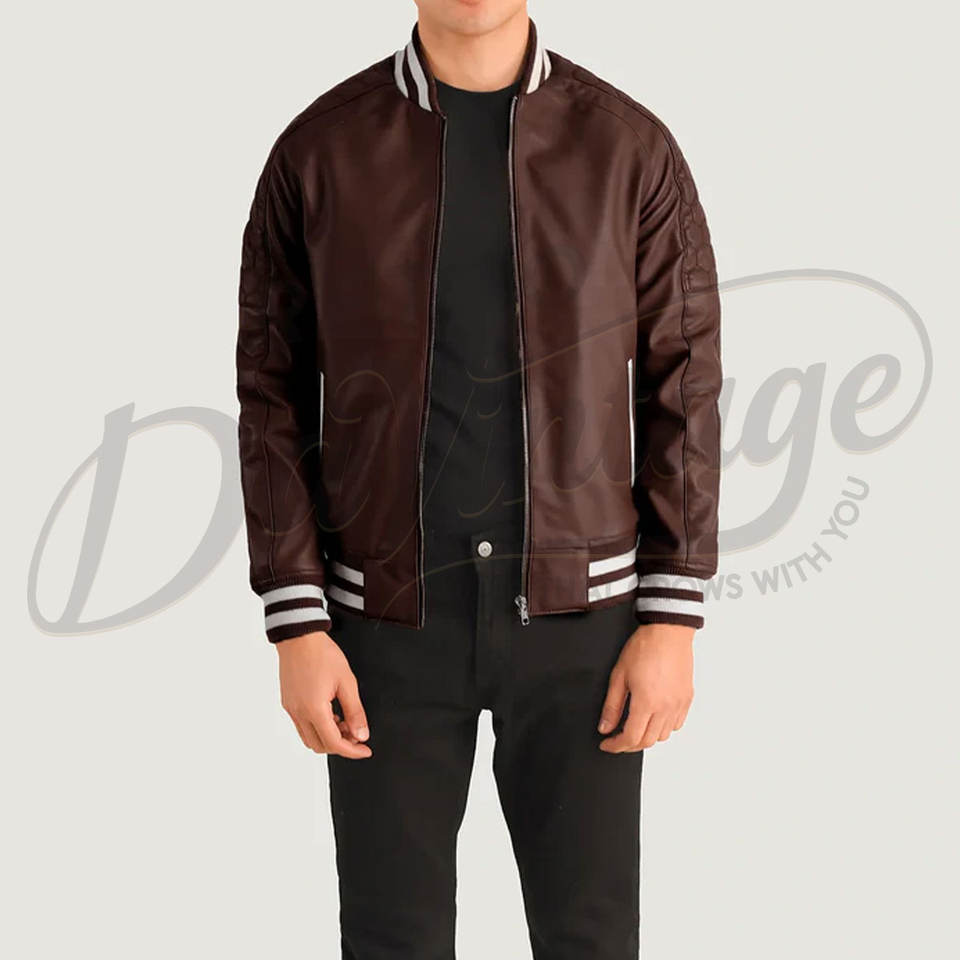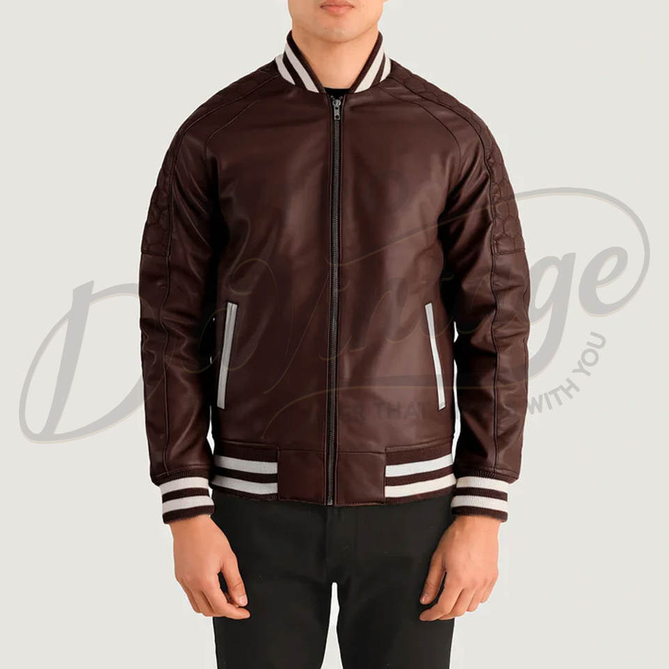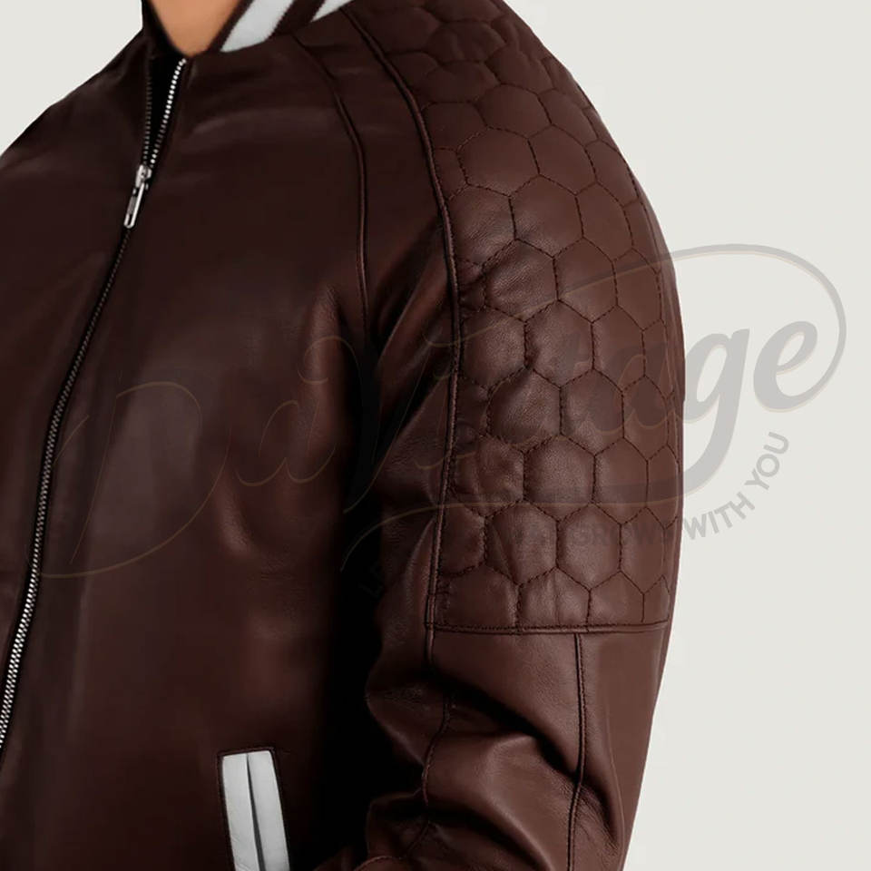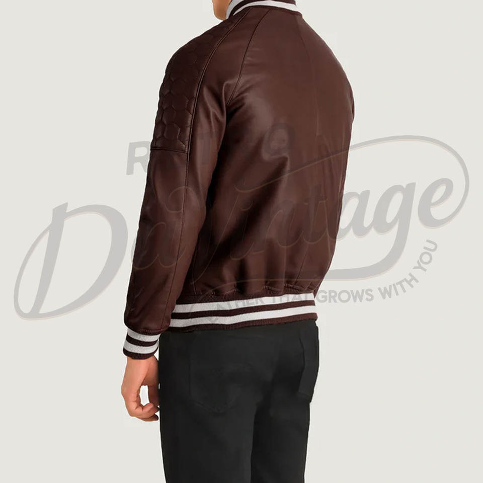 Blouson Bomber en Cuir Marron pour Homme avec Manches Matelassées Nid d'Abeille et Poignets Côtelés Rayés – Vêtement d'Extérieur Sportif Premium