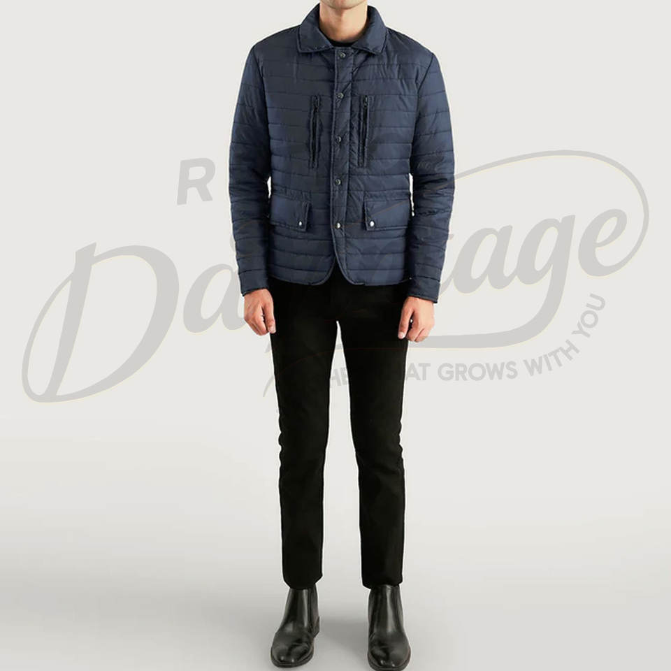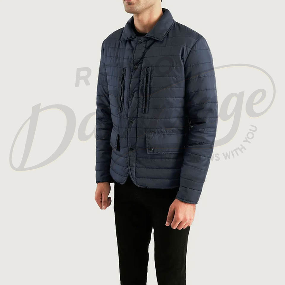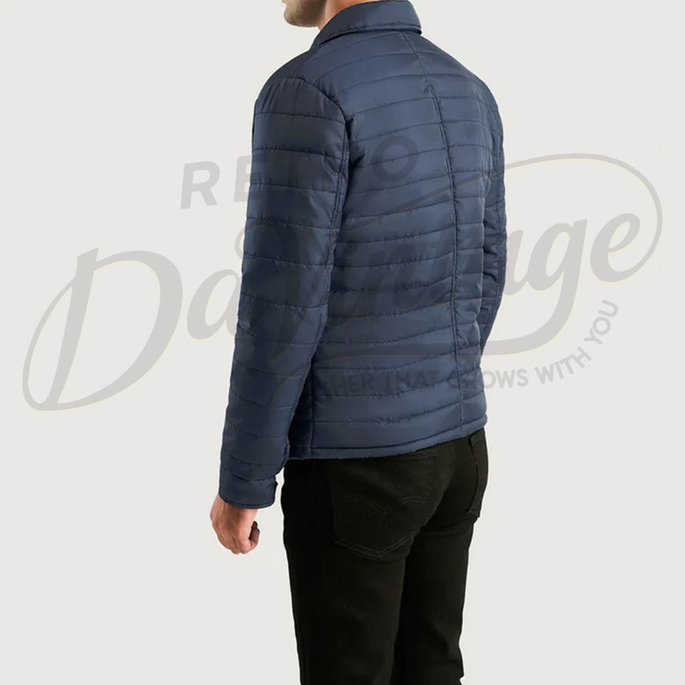 Veste matelassée légère bleu marine pour homme avec col chemise, manteau rembourré décontracté avec deux poches zippées sur la poitrine