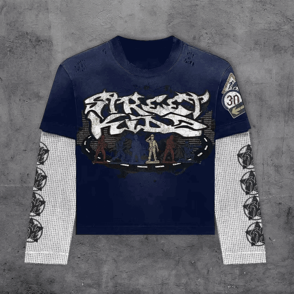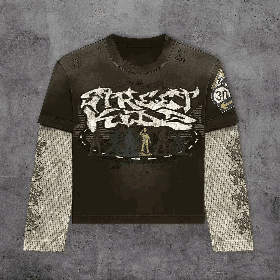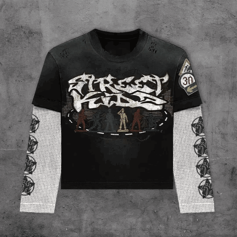 Hommes Nouveau DTG Graphics Retro Double Layer T Shirt Oversized Round Neck Cotton Long Sleeve Tops Y2K Double Layer Long Sleeve TShirt