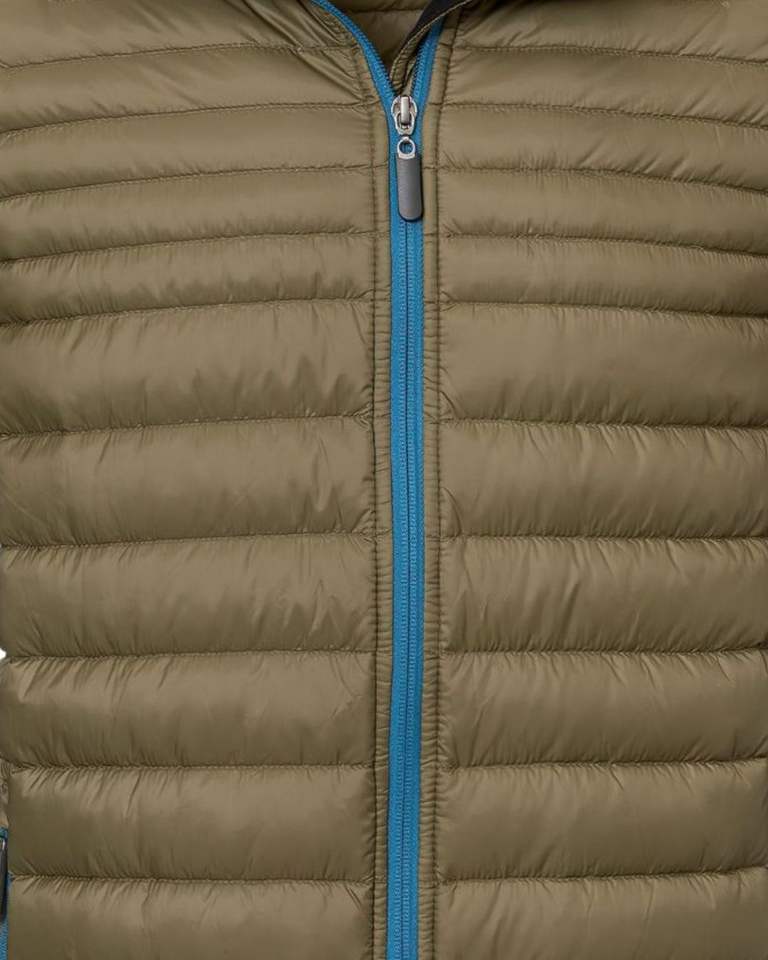 Men Olive Green Lightweight Down Jacket with Blue Hood Casual Puffer Windproof Zipper Coat for Outdoor Winter Wear