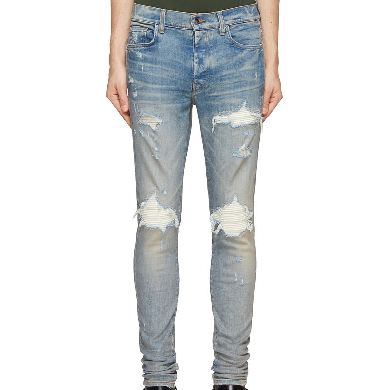 Jean en denim déchiré bleu clair premium pour homme, coupe skinny, en coton doux et extensible, style motard, coupe ajustée, pantalon décontracté et tendance