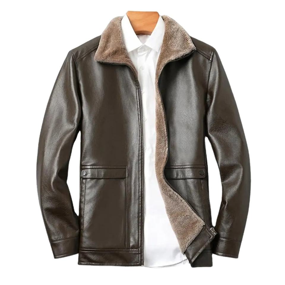 Veste en cuir véritable pour hommes Veste en cuir véritable à revers élégante pour hommes avec doublure en peluche Poches latérales Coupe-vent Biker pour l'hiver