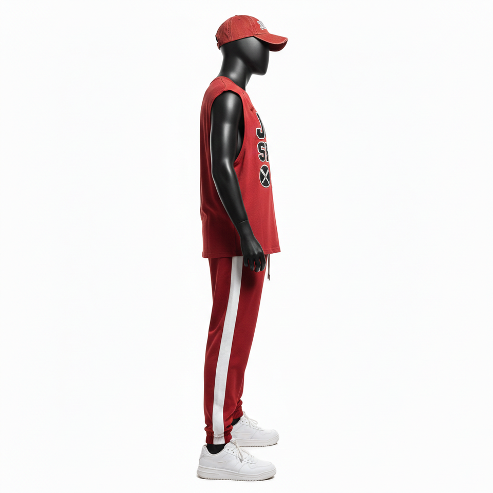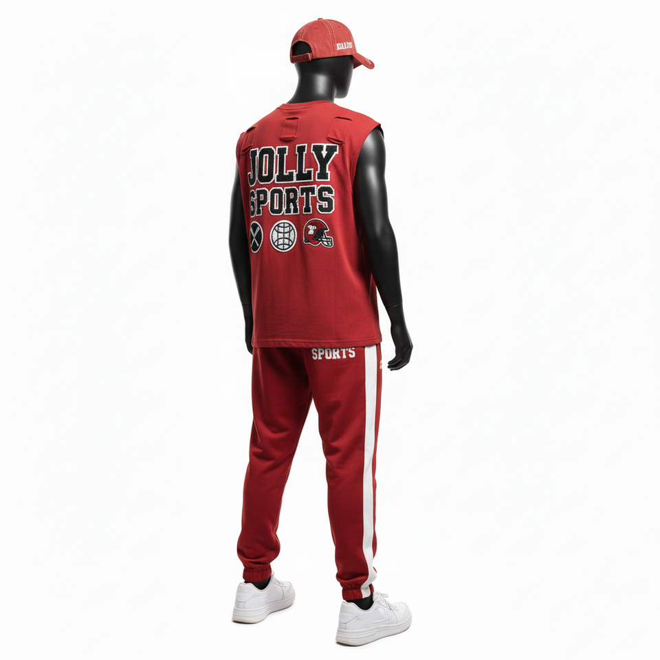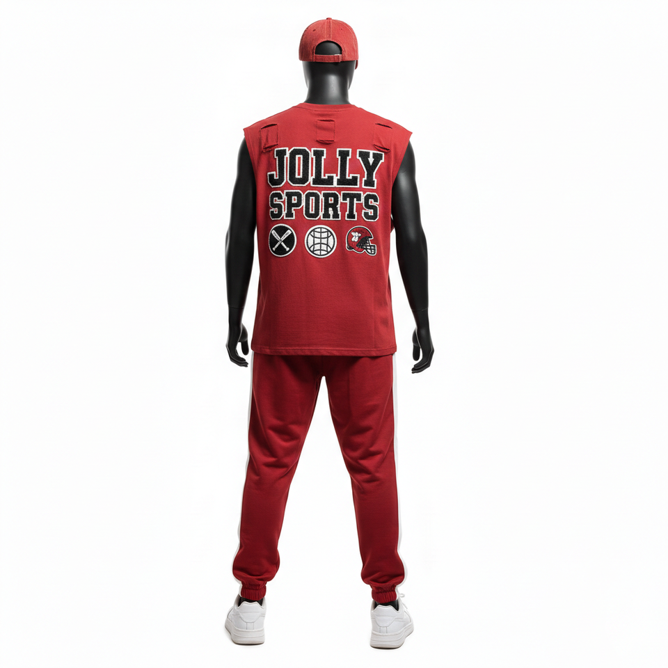 Ensemble deux pièces sans manches pour homme en jersey de coton premium, couleur rouge, panneau latéral avec logo personnalisé par transfert thermique, t-shirt et pantalon sans manches pour homme