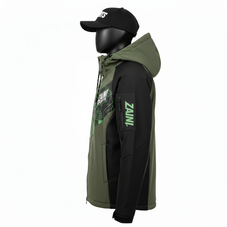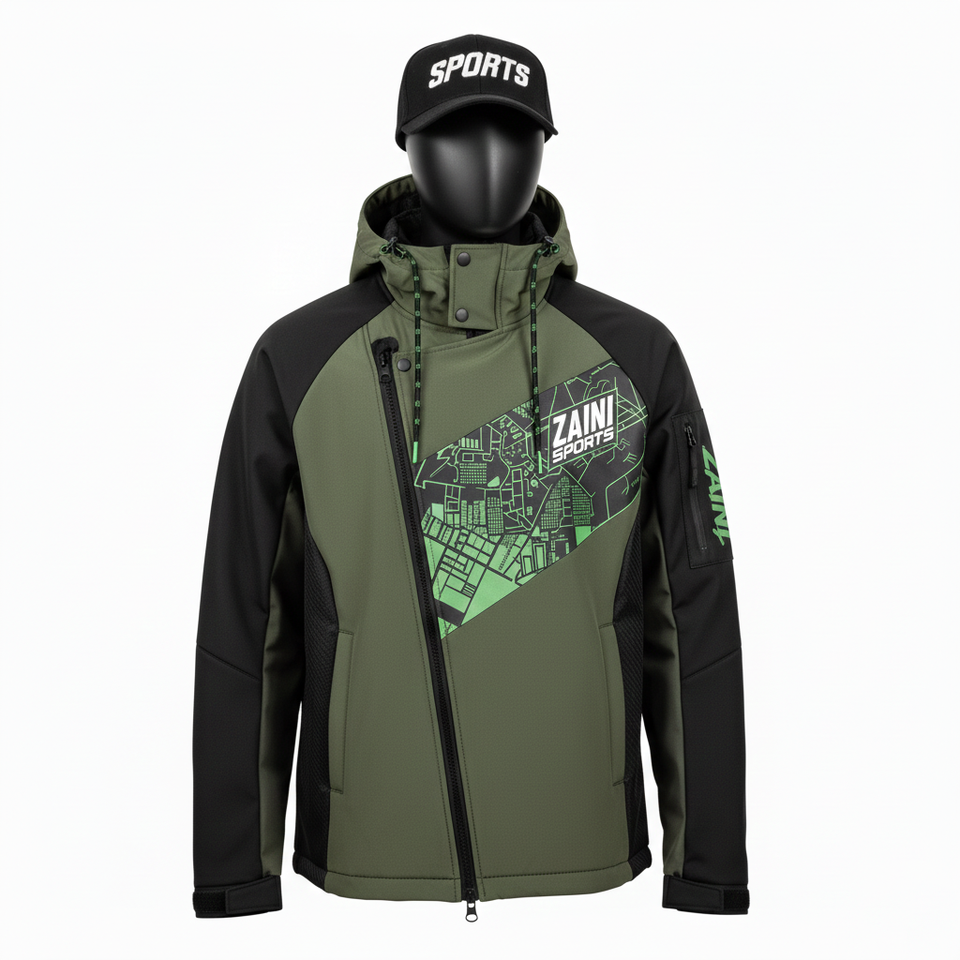 Veste Softshell Homme Premium 300 GSM Tissu Softshell Coupe-Vent Olive Noir Panneaux Contrastés Logo Personnalisé Veste Softshell pour Homme