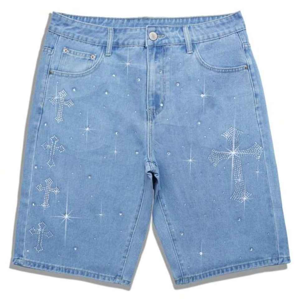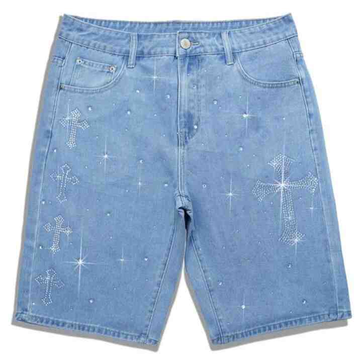 Men Streetwear Denim Shorts Jeans Custom Vintage Cotton Raw Edge Zipper Custom Men Jeans Shorts with Rhinestones Denim Shorts