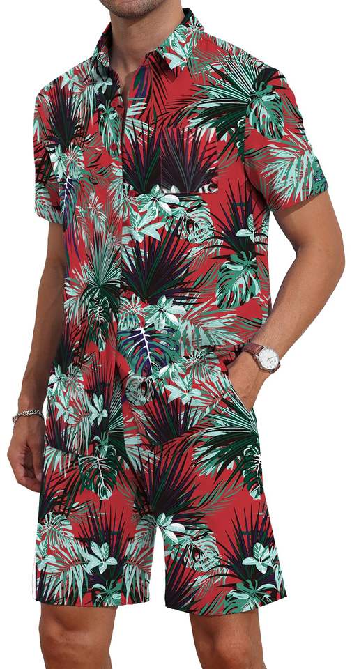 Ensemble deux pièces pour homme, imprimé jungle, chemise à manches courtes et short de plage assortis, tenue décontractée estivale colorée pour les vacances
