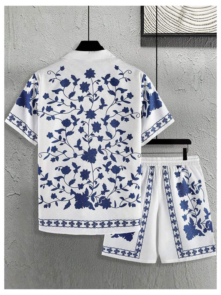 Ensemble de vacances pour hommes : chemise à manches courtes imprimée et short de plage assorti, tenue décontractée estivale colorée et légère, ensemble deux pièces pour hommes