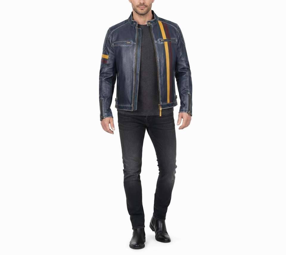 Veste en cuir véritable pour homme, style vintage, avec bande contrastée