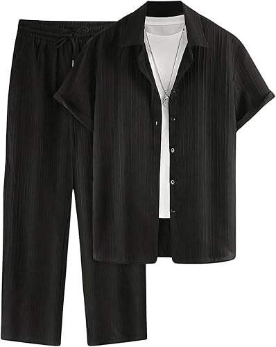 Ensemble 2 pièces pour homme, chemise à manches courtes à boutons, pantalon ample, tenue de plage estivale