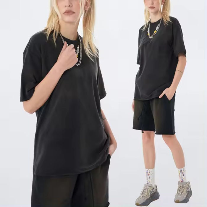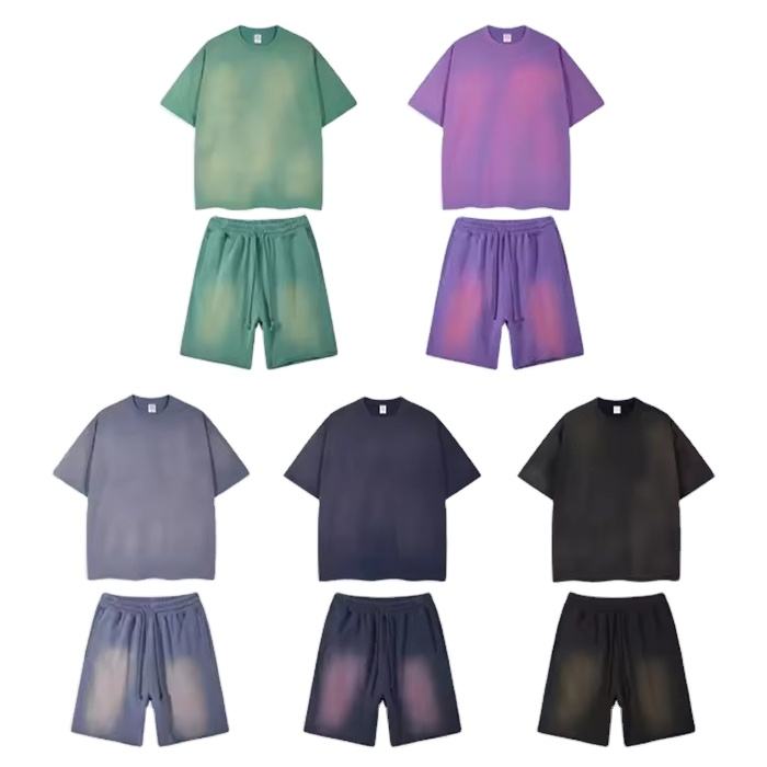 Ensemble short et chemise décontracté pour homme en coton délavé à l'acide, style streetwear, imprimé sérigraphié effet soleil délavé, idéal pour l'été
