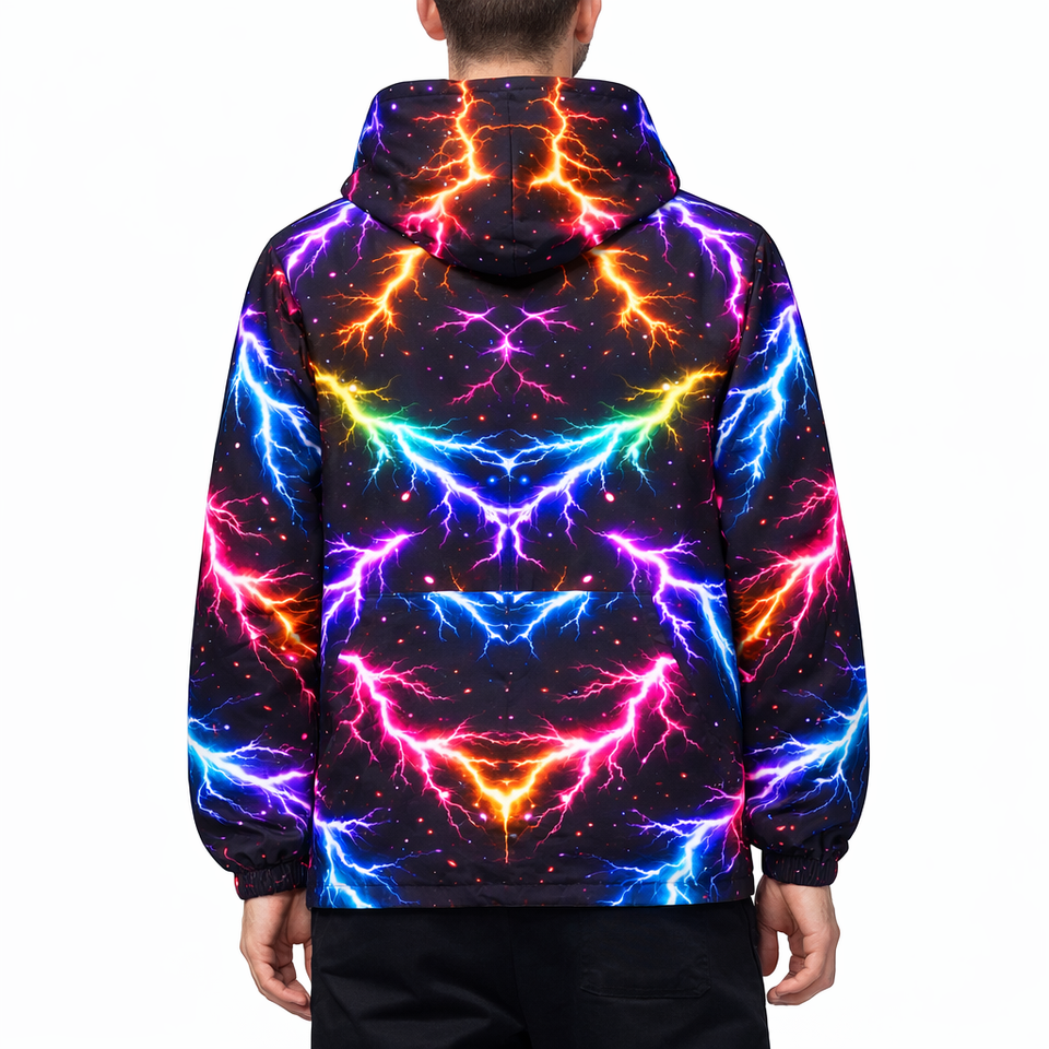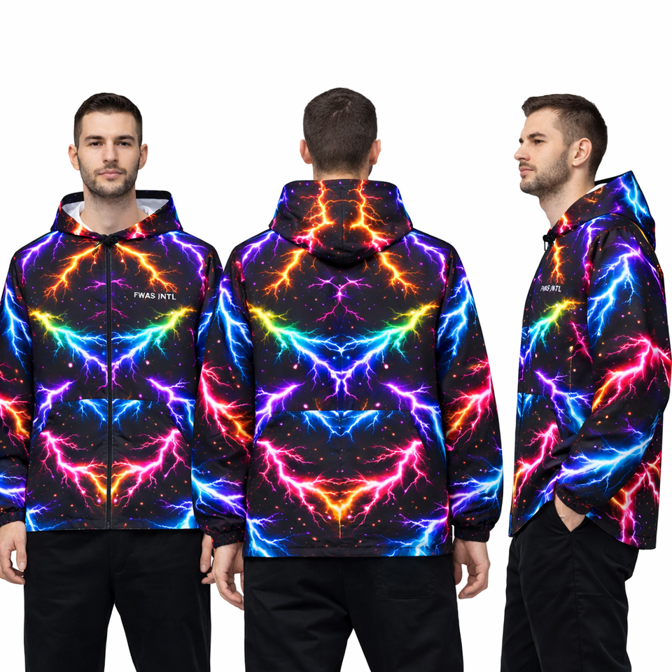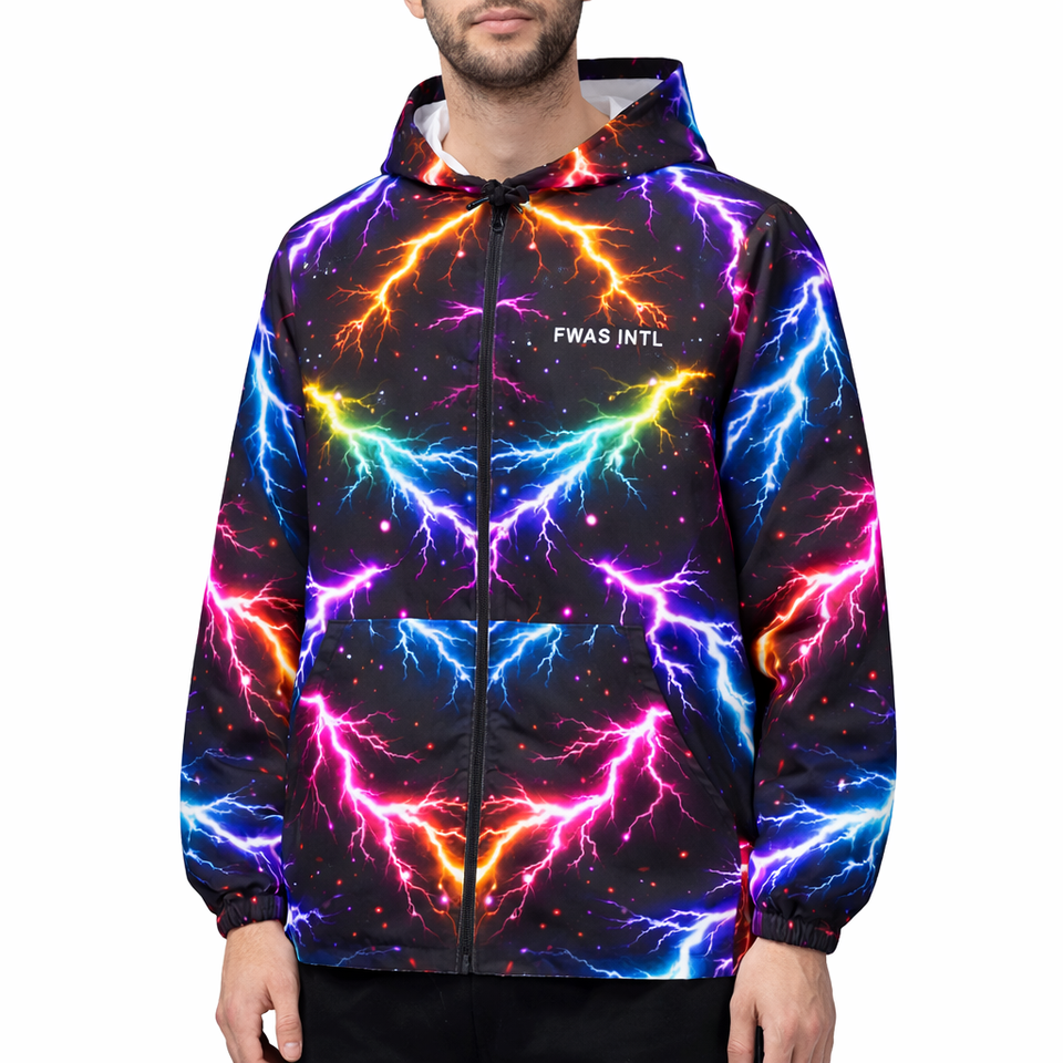 Veste à capuche zippée pour homme, imprimé néon éclair intégral, style streetwear Y2K, légère, fournisseur OEM en gros pour les acheteurs américains, vestes pour hommes