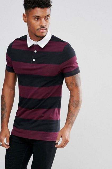 T-shirt homme anti-rides en sergé teint en fil 100 % coton, motif rayé, col montant, coupe droite, manches courtes, style décontracté chic