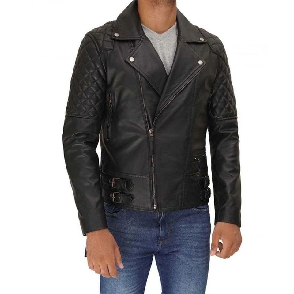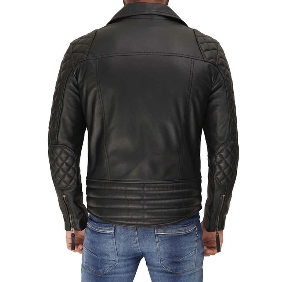 Veste en cuir d'agneau matelassée de style motard pour homme avec col rabattu, fermetures éclair sur le devant, col asymétrique, design coupe-vent