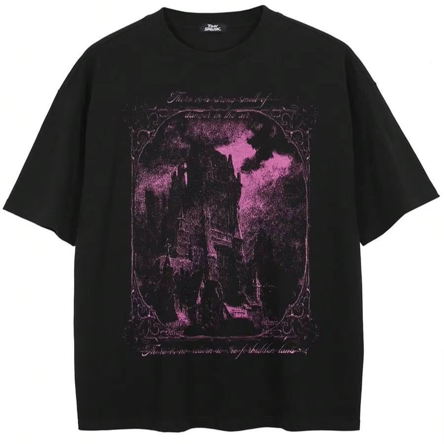 T-shirt noir à motif château d'horreur pour hommes, personnalisable, adapté aux jeunes, hommes et femmes F10