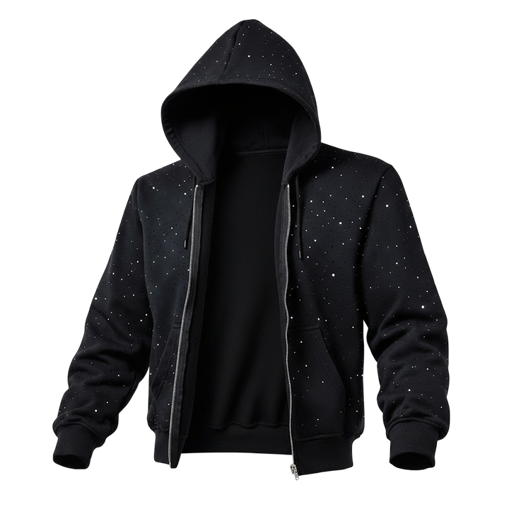 Sweat-shirt à capuche zippé noir pour homme avec strass, en molleton personnalisé, style streetwear décontracté avec poches avant