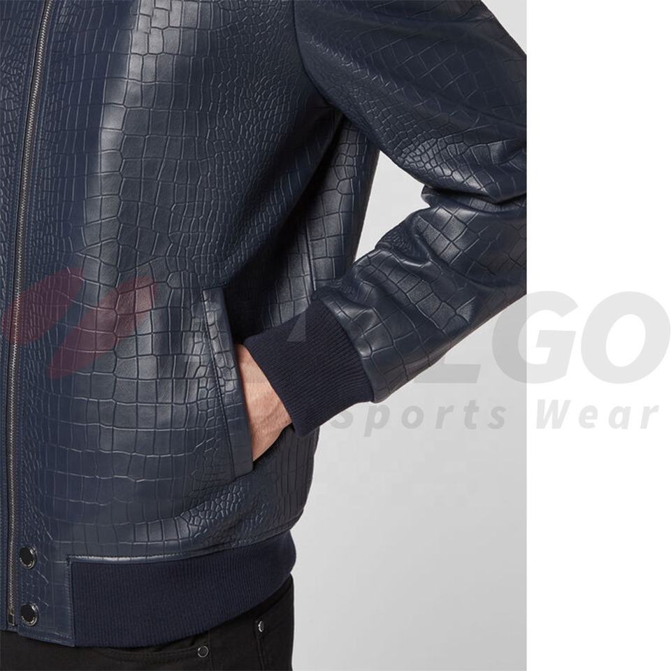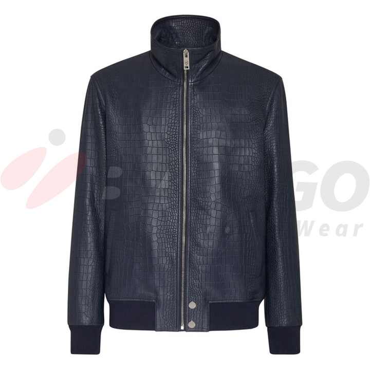 Men's Blue Crocodile Leather Jacket New Bomber Style Croc Print Embossed Jacket