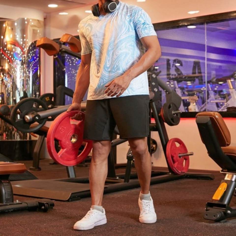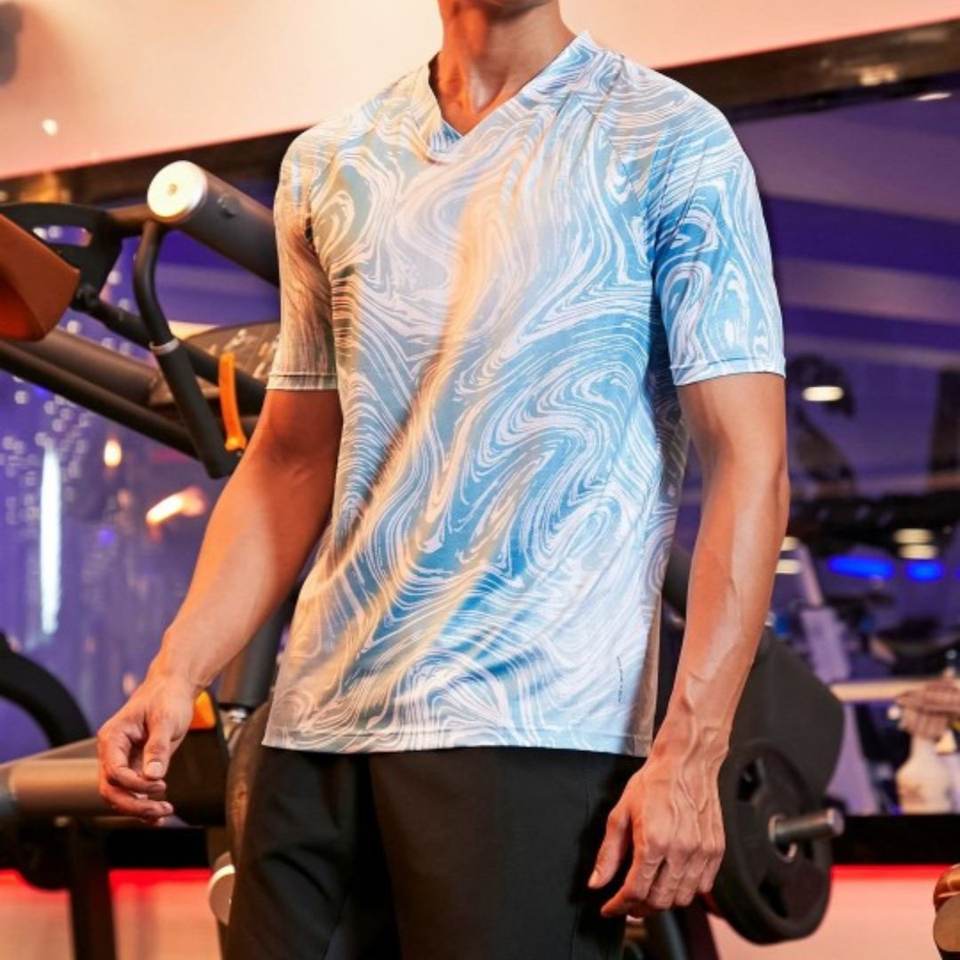 T-shirt col V bleu homme Design abstrait Longueur régulière Manches courtes Tissu jersey tricoté Grande taille GYM Wear Made Polyester