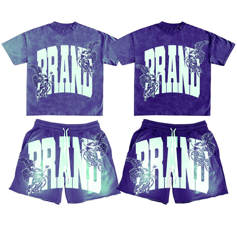 Vêtements de sport respirants à séchage rapide pour hommes, vêtements de sport lavés à l'acide, ensemble 2 pièces d'été imprimé par transfert de chaleur, vêtements d'extérieur 100%