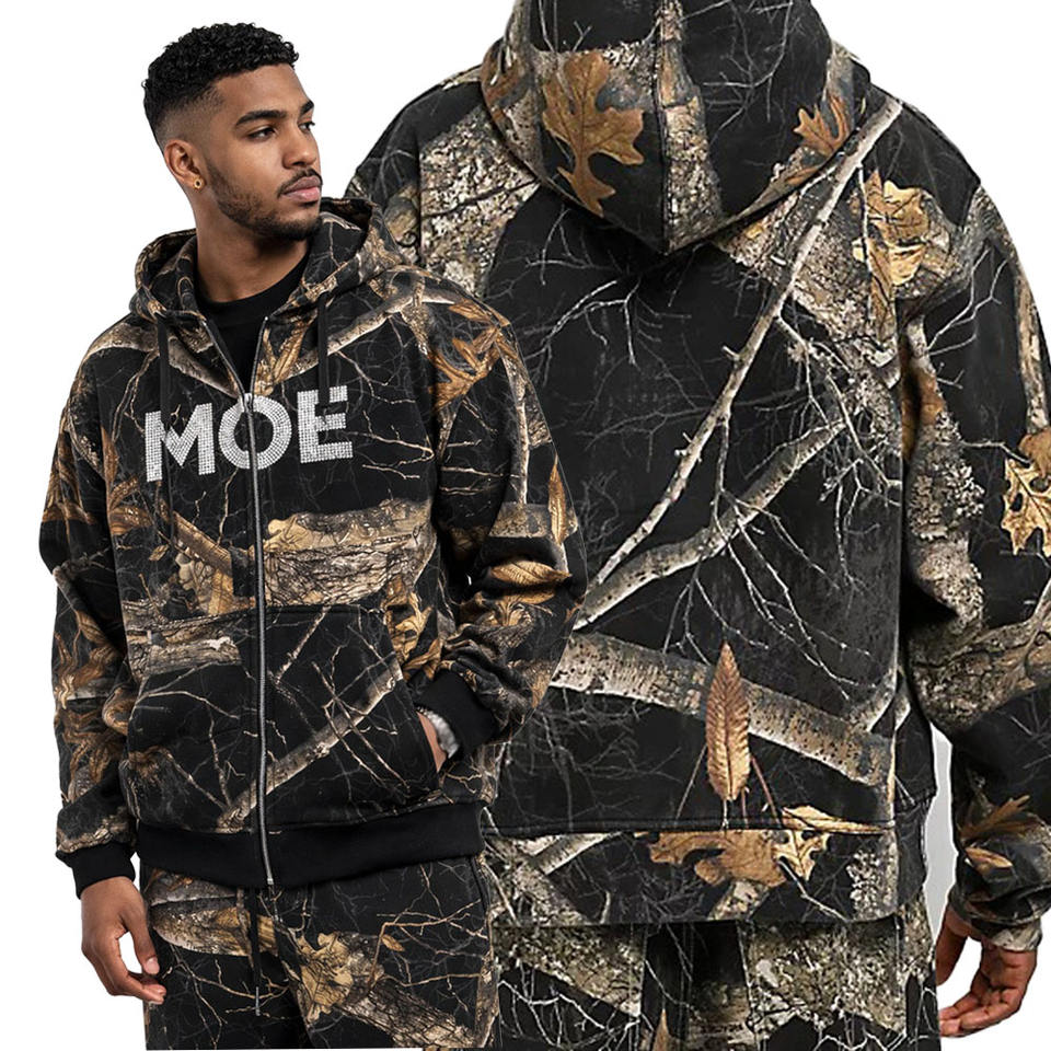 Sweat à capuche zippé camouflage en coton pour homme, style streetwear hip-hop oversize, personnalisable, vente en gros, OEM, sweats à capuche tendance