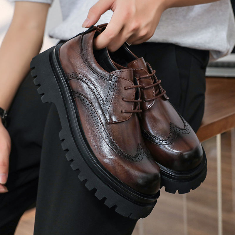 Men's Casual Leather Breathable Lightweight Shoes Brown English Style Platform Elevation Summer Weddings Lace-Up Closure 1808-R