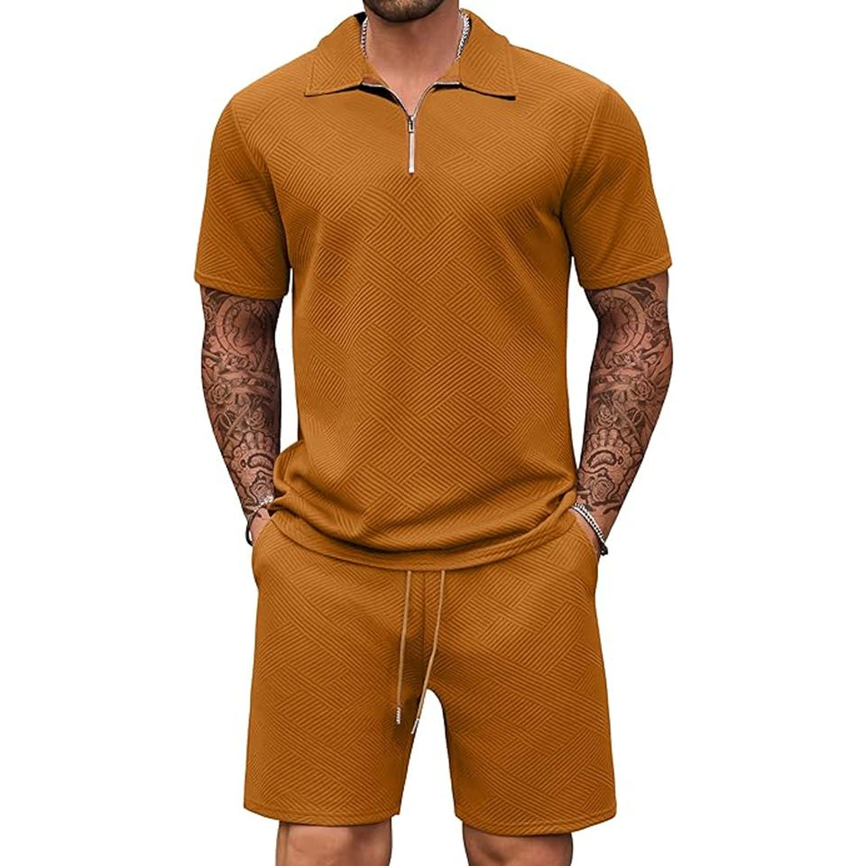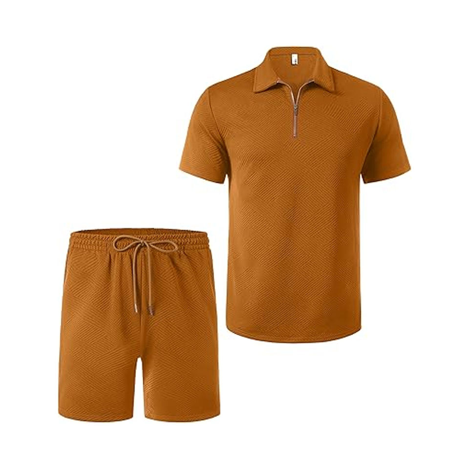 Ensemble polo short décontracté 2 pièces à fermeture éclair et quart de short marron clair pour homme Ensemble polo gaufré à demi-fermeture éclair avec caractéristiques haute visibilité