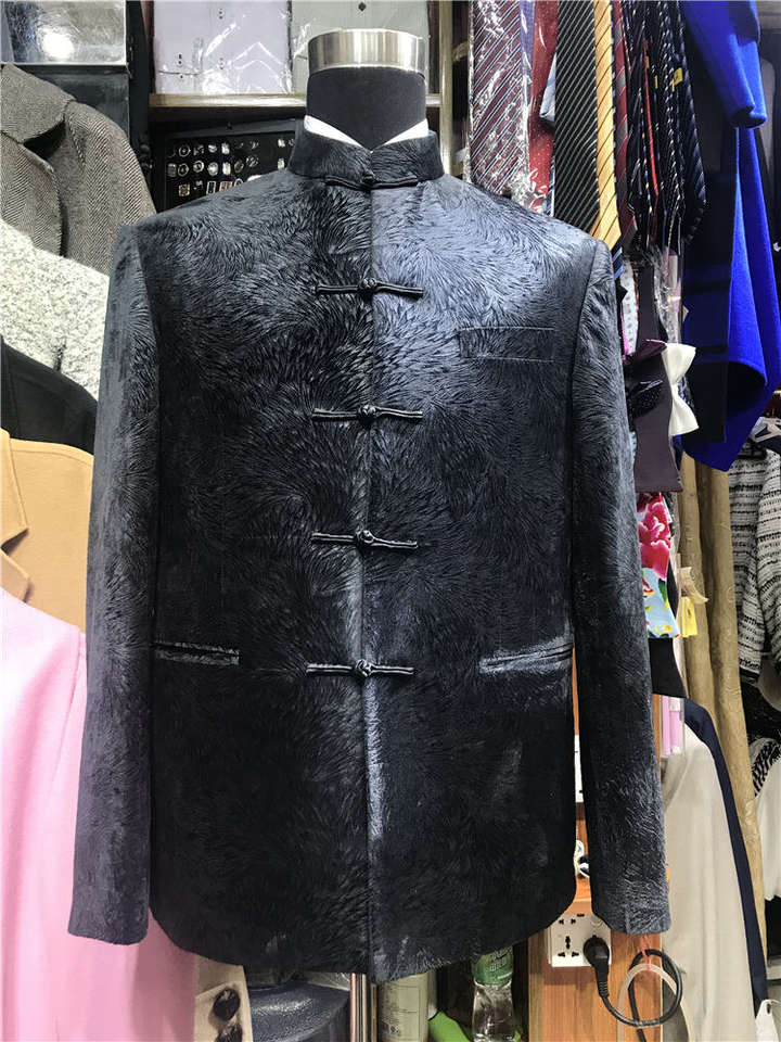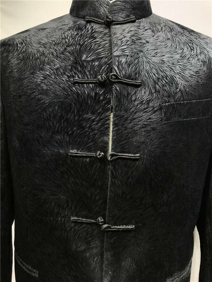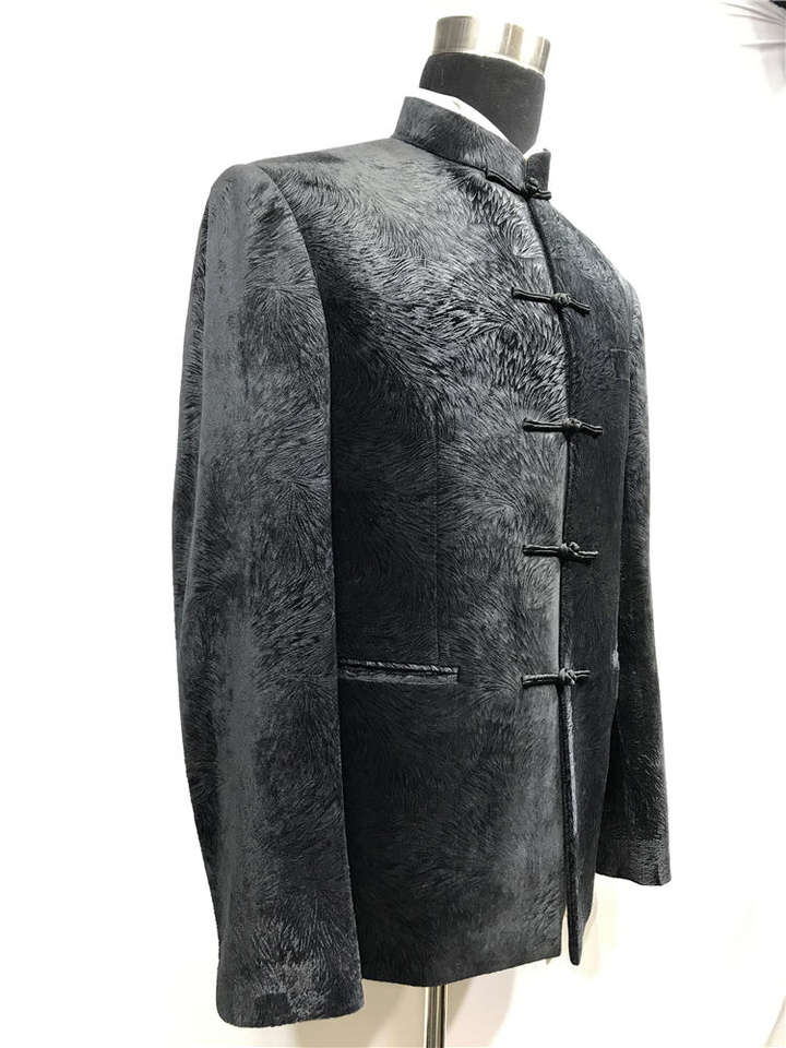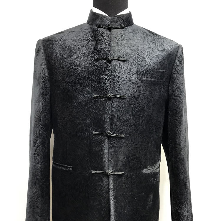 Costume Mao de style chinois pour hommes avec fermeture à simple boutonnage Manteau de queue imprimé noir avec boutons chinois et pantalons longs