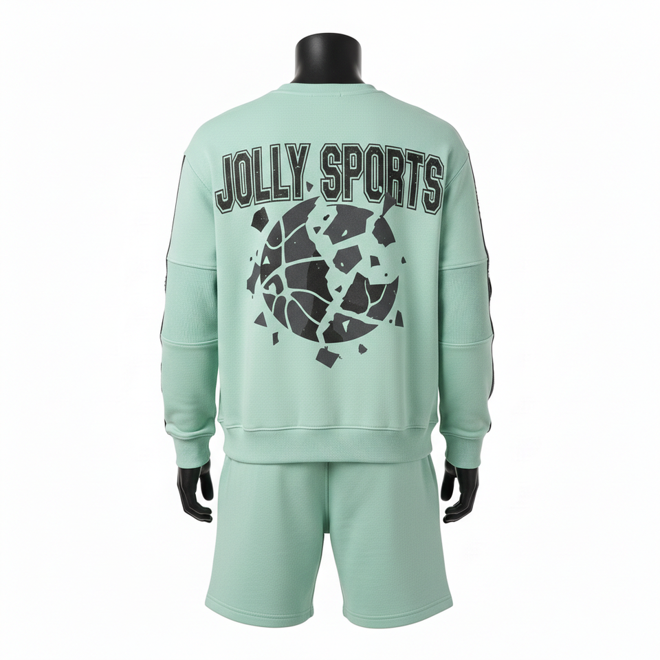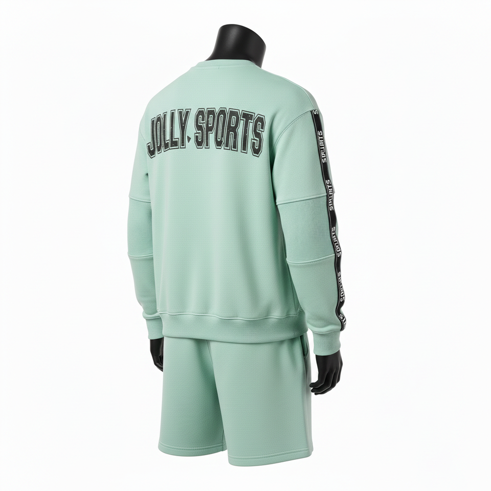 Ensemble sweat-shirt et short en molleton de coton et polyester pour homme, avec bande contrastante et logo imprimé.