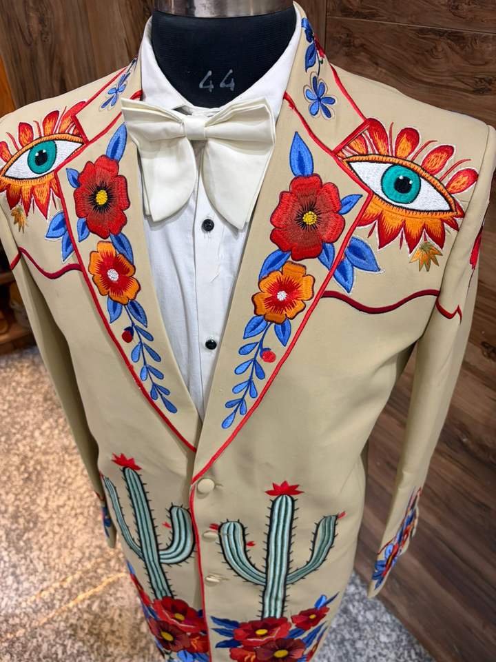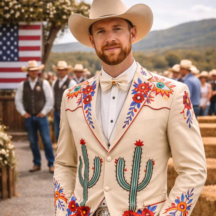 Costume Western brodé crème pour homme avec motifs floraux et cactus – Ensemble blazer et pantalon style cowboy pour mariage