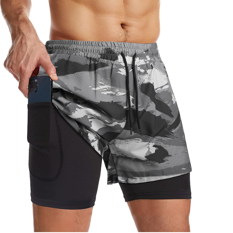 Short de sport de gymnastique 2 en 1 camouflage personnalisé pour hommes, séchage rapide, entraînement en polyester, motard, basket-ball, course à pied, cordon de serrage, doublure vierge pour