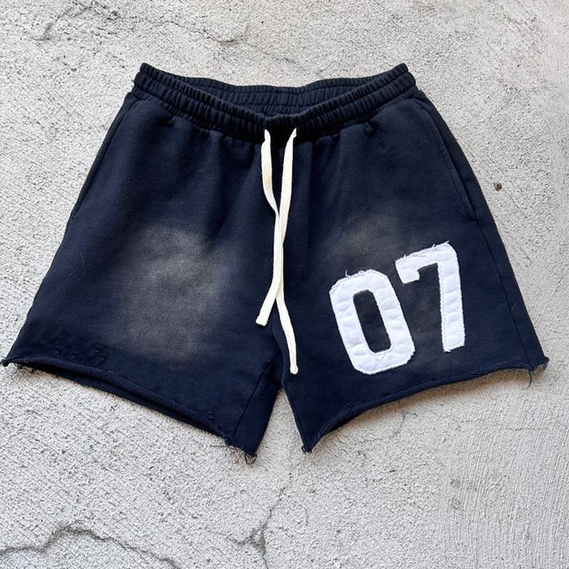 Short en coton éponge français style rue haute personnalisé pour hommes broderie en détresse lavage à l'acide ourlet brut taille élastique-Style délavé au soleil