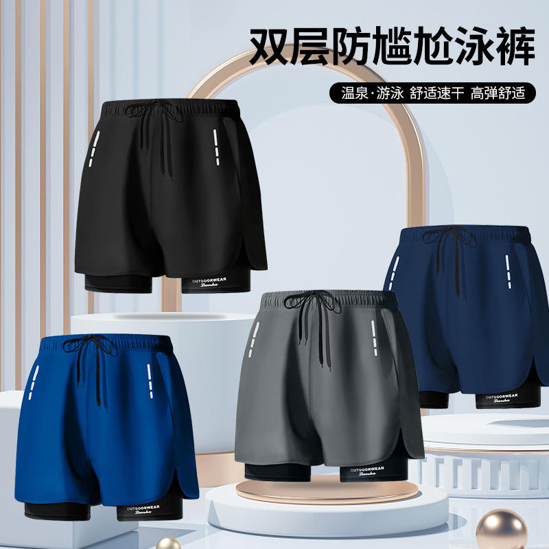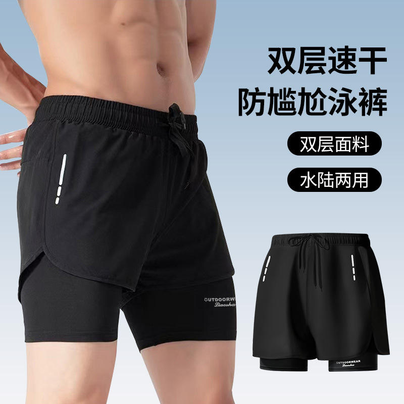 Short de bain double couche pour homme, séchage rapide, anti-embarras, short de plage, short de fitness et de course, couleur unie, élastique et confortable